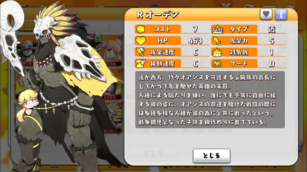 | Lv | コスト | タイプ | HP | 攻撃力 | 攻撃速度 | 対象数 | 移動速度 | サーチ | スキル発動率 | スキル | ヒーローへの攻撃力 | 攻撃速度(秒) |