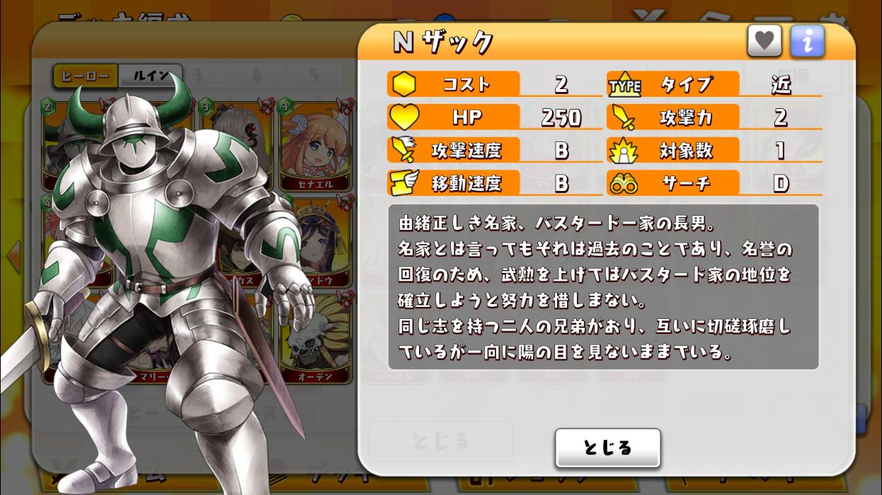 | Lv | コスト | タイプ | HP | 攻撃力 | 攻撃速度 | 対象数 | 移動速度 | サーチ | スキル発動率 | スキル | ヒーローへの攻撃力 | 攻撃速度(秒) |