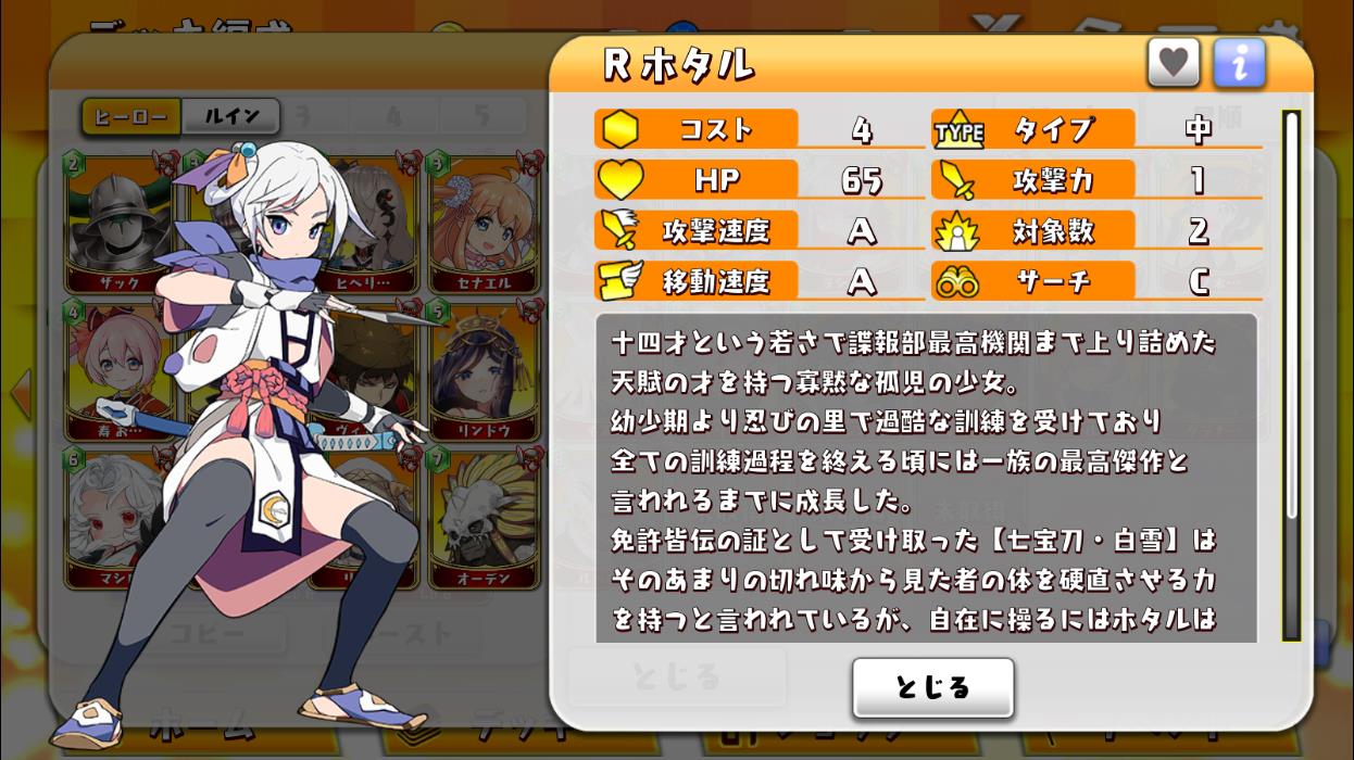 | Lv | コスト | タイプ | HP | 攻撃力 | 攻撃速度 | 対象数 | 移動速度 | サーチ | スキル発動率 | スキル | ヒーローへの攻撃力 | 攻撃速度(秒) |