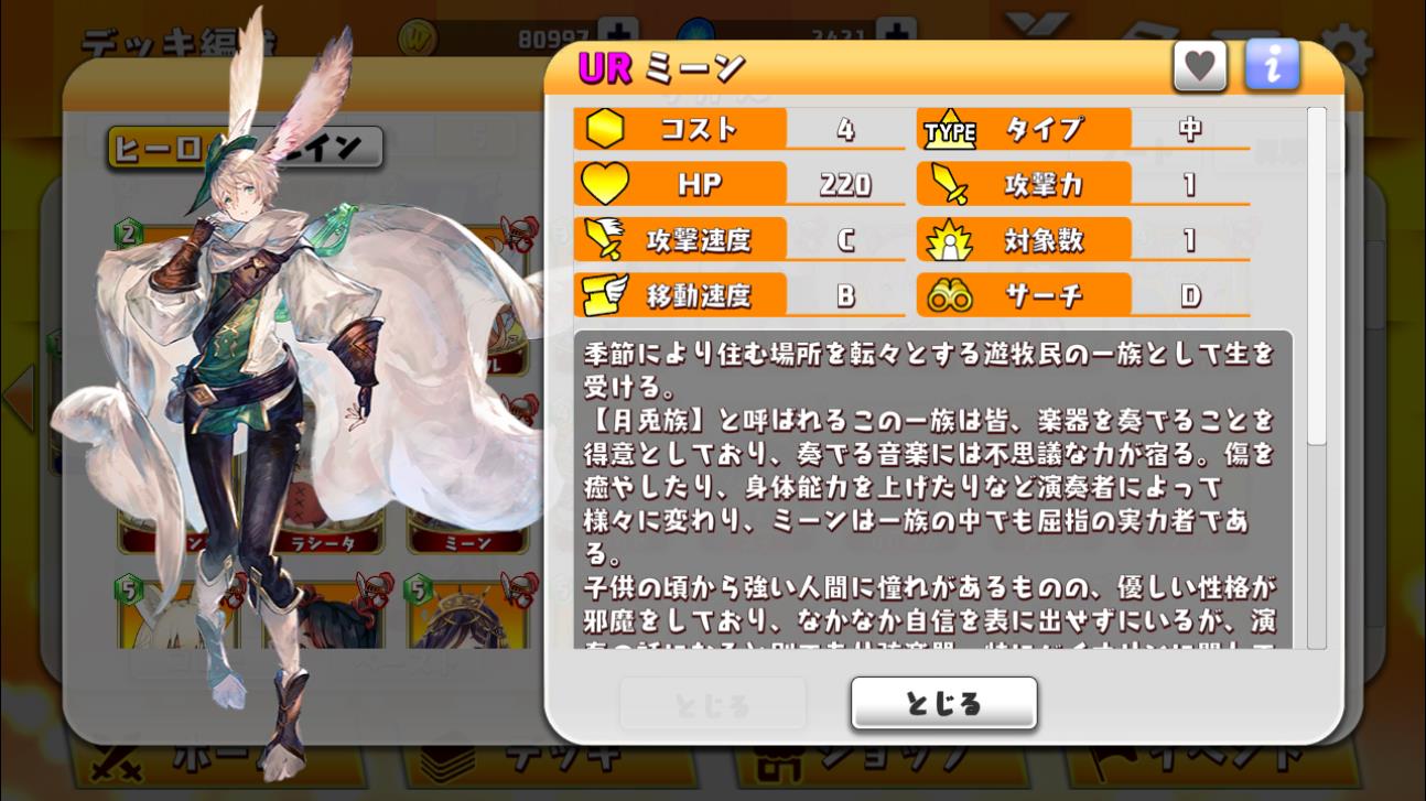 | Lv | コスト | タイプ | HP | 攻撃力 | 攻撃速度 | 対象数 | 移動速度 | サーチ | スキル発動率 | スキル | ヒーローへの攻撃力 | 攻撃速度(秒) |