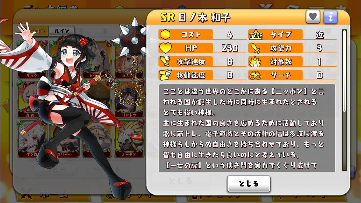 | 7 | 4 | 近 | 360 | 6 | B | 1 | B | D | 30% | 攻撃中のタワーに元の攻撃力分のダメージを与え、その後9秒間、自身の攻撃力を50%アップ。 | 3 |